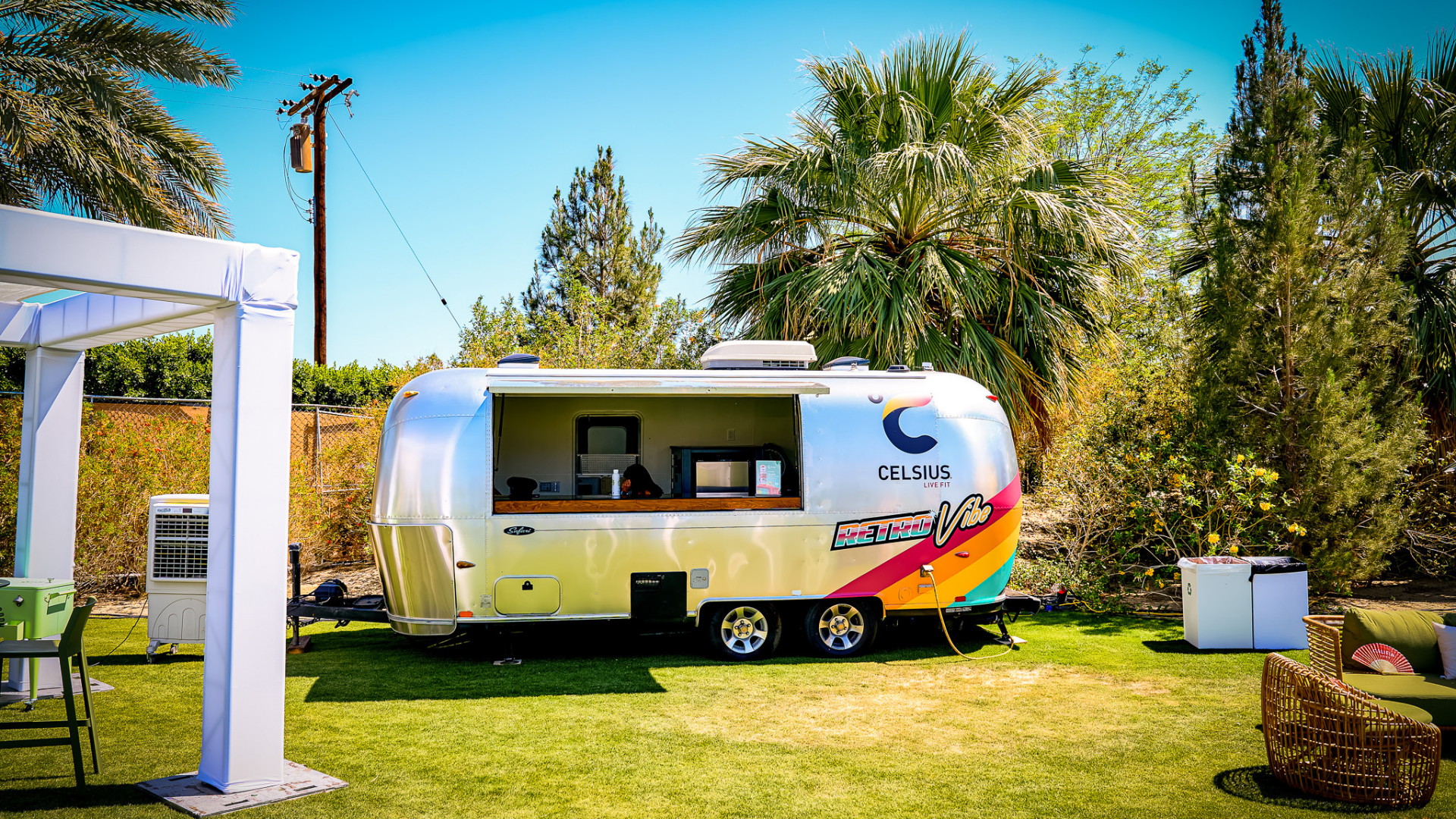We transformed “Leila,” our Concessions Airstream trailer rental into a fully branded centerpiece by wrapping the exterior in custom Celsius graphics. Leila served a dual purpose: a functional beverage service hub and a high-impact stage for live music and DJ performances throughout the weekend.