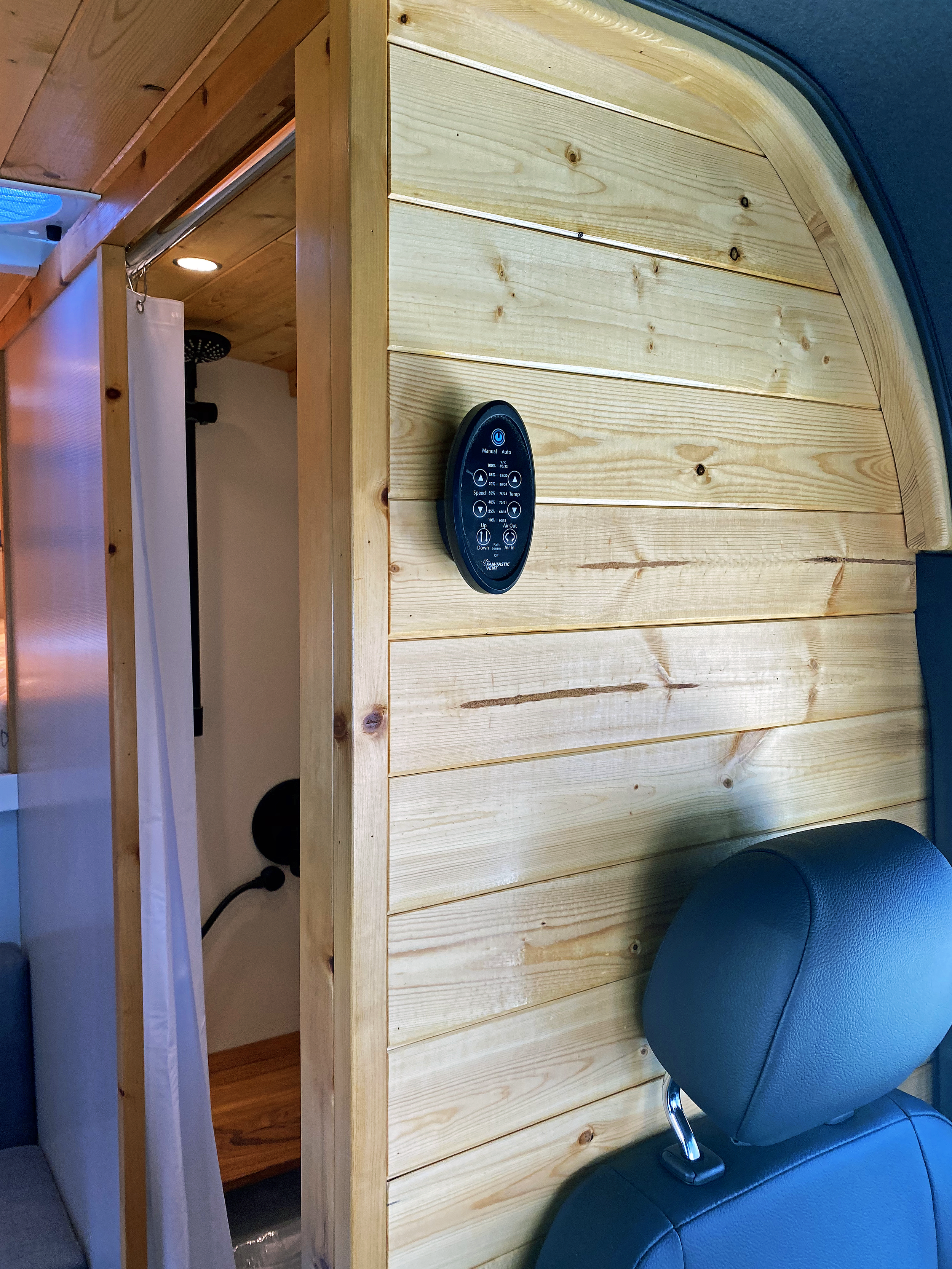 The spa-like wet bath, accented with teak, offers a luxurious retreat after a day on the trails. Warm wooden walls and ceilings bring a cozy cabin feel, while behind the scenes, top-tier wiring, insulation, and advanced systems ensure this mobile basecamp is as functional as it is beautiful.
